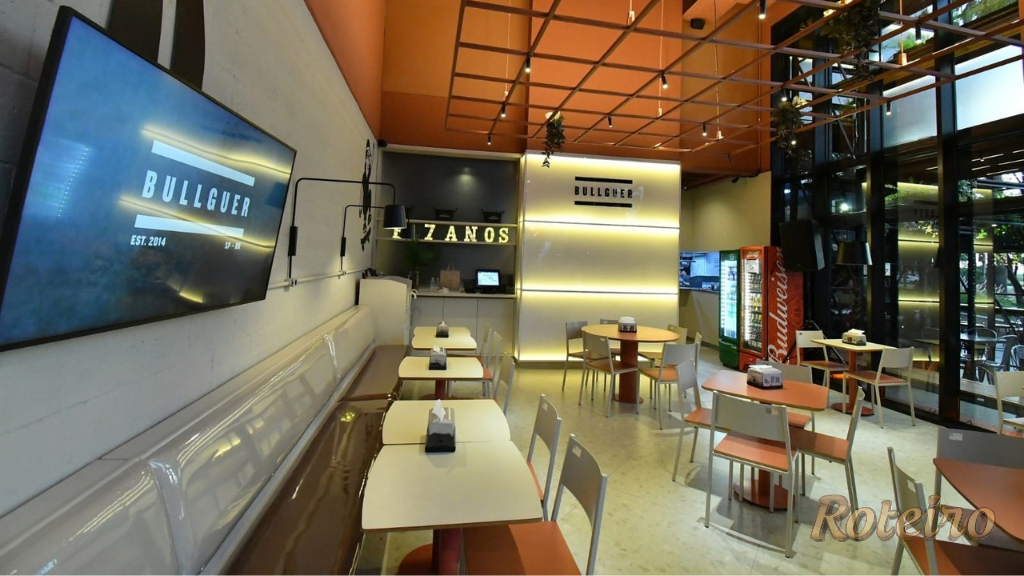 Ao entrar na nova unidade, a mudança é nítida. O estilo industrial deu lugar a um ambiente contemporâneo, mais claro e extremamente aconchegante. A iluminação e a disposição das mesas foram planejadas para convidar o cliente a ficar mais tempo, tornando o Bullguer o local ideal para encontros de famílias e grupos de amigos.