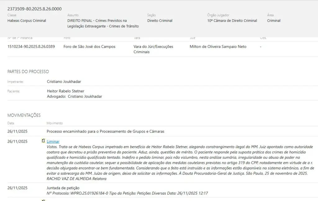 O processo que envolve a morte do jovem Matheus Helfstein segue em destaque nacional. Recentemente, foi indeferido o pedido liminar de liberdade solicitado pela defesa de Heitor Rabelo Stetner, acusado de causar o acidente fatal. O habeas corpus não foi aceito, já que não houve comprovação de ilegalidade na prisão diante das provas reunidas no processo.