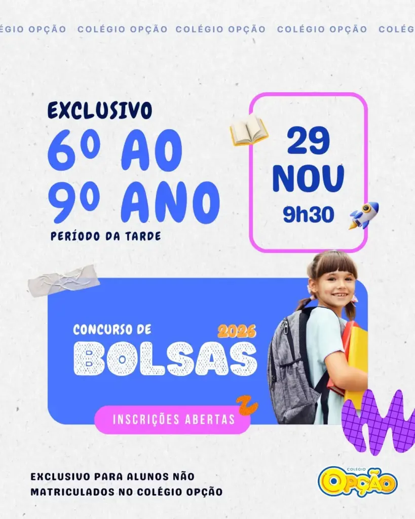 Com o compromisso de ampliar o acesso, o Colégio Opção promove o Concurso de Bolsas 2026 para o Ensino Fundamental – Anos Finais (6º ao 9º ano), exclusivo no período da tarde. As bolsas podem chegar a 100% e o processo seletivo será em 29 de novembro.