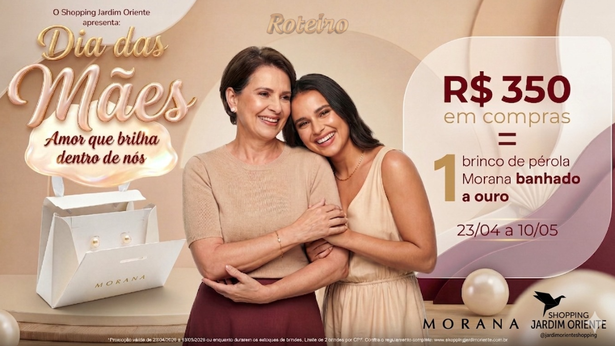 O Shopping Jardim Oriente, na zona sul de São José dos Campos, iniciou a campanha “O Amor que Brilha dentro de Nós”. Para celebrar o Dia das Mães 2026, o centro de compras preparou uma promoção “Comprou, Ganhou” que promete movimentar o varejo local com um presente sofisticado: um par de brincos de pérola, banhado a ouro, da renomada marca Morana.