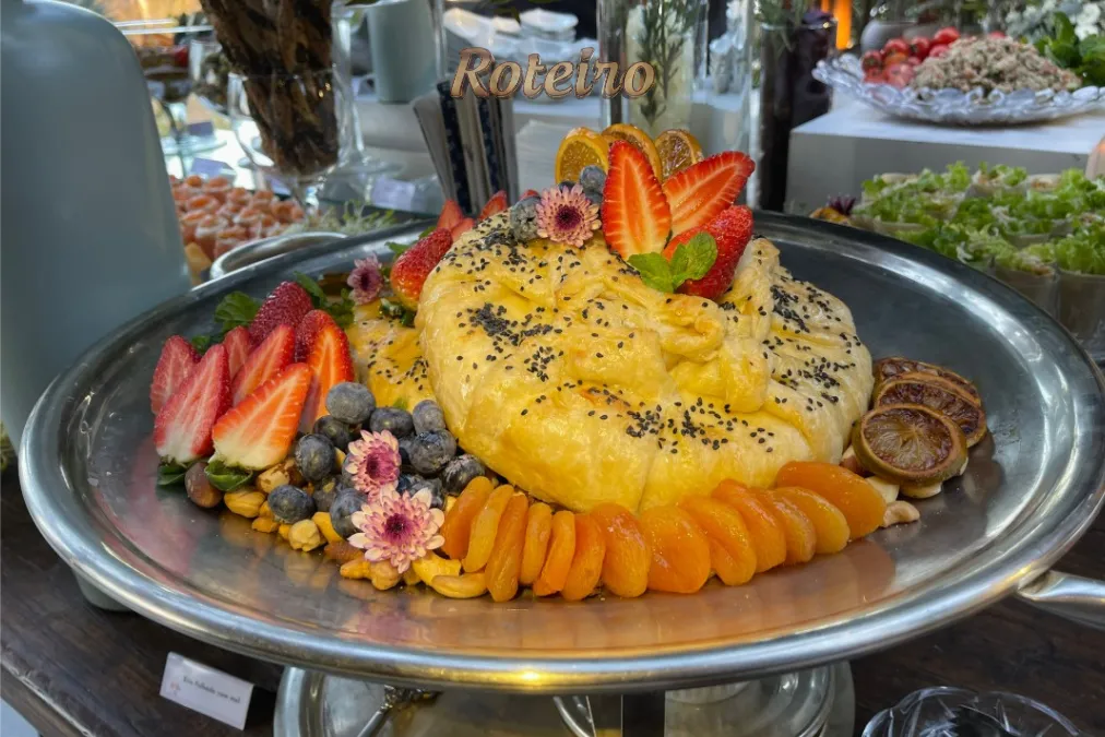 • Brie folhado com favos de mel, amoras, morangos selecionados, mirtilo e cerejas frescas