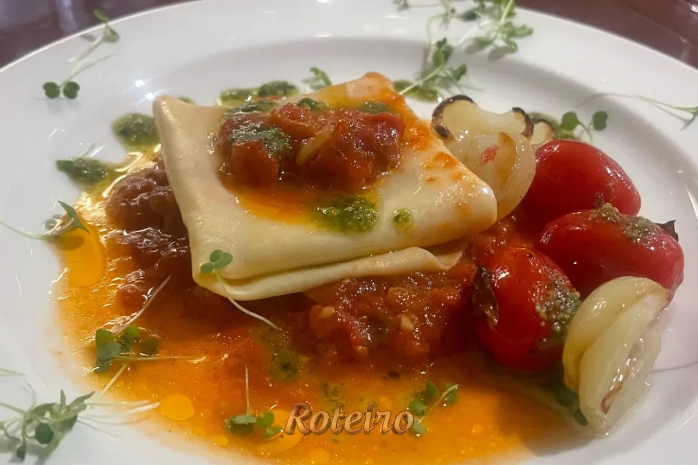 • Agnolotti de mussarela de búfala com peras e gorgonzola ao bechamel (acompanha bem o peru e o pernil)