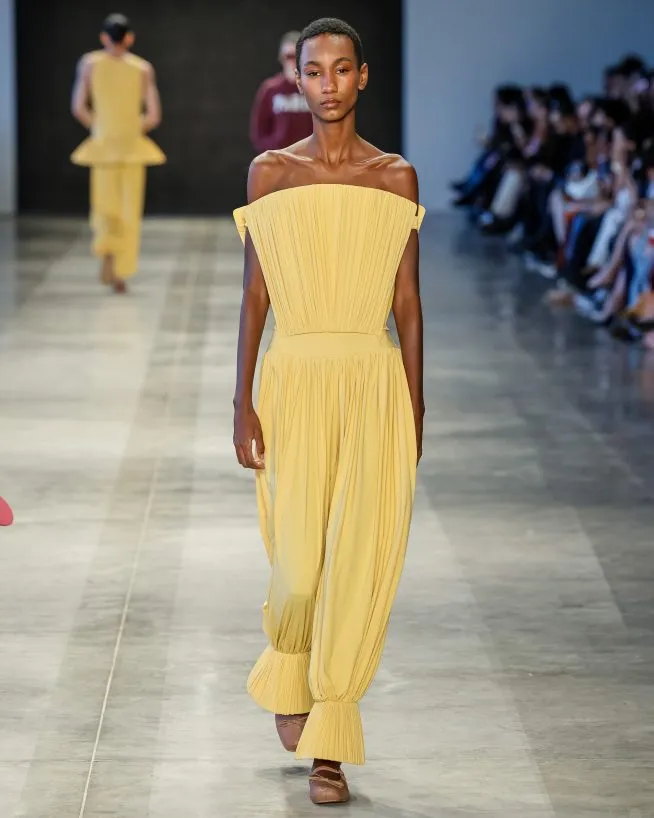 Veremos muitos tecidos leves e naturais, como linho e algodão, que são perfeitos para o clima quente, assim como peças de alfaiataria leve e vestidos fluidos.