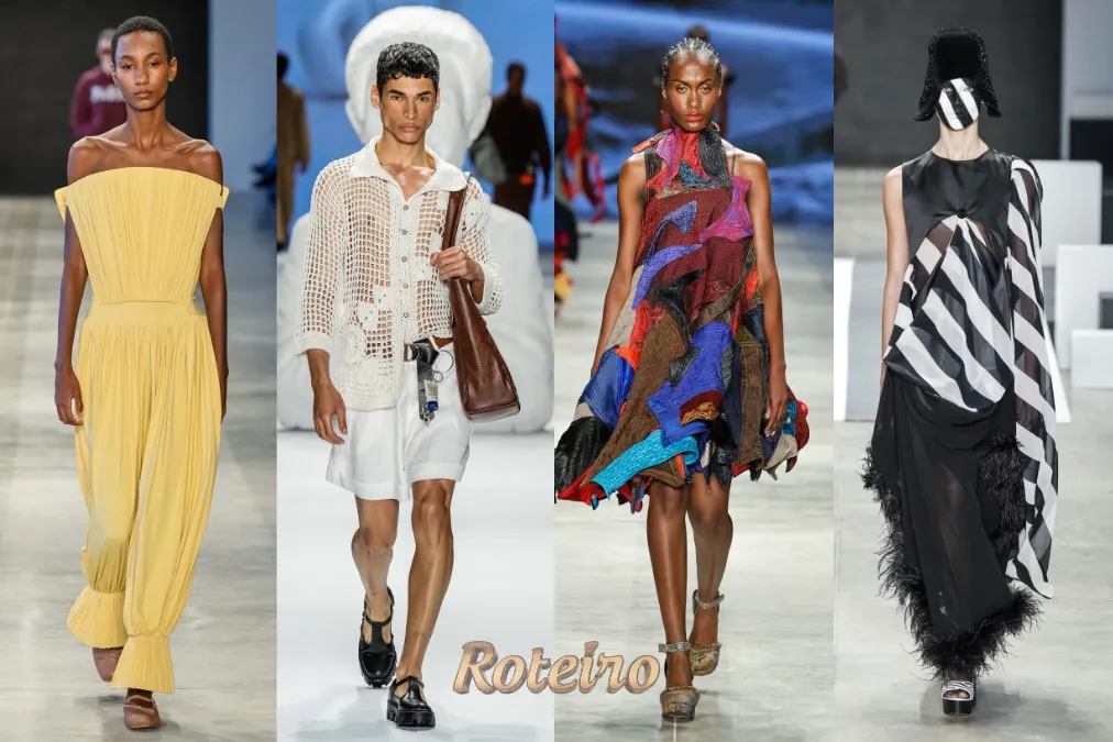 Veremos muitos tecidos leves e naturais, como linho e algodão, que são perfeitos para o clima quente, assim como peças de alfaiataria leve e vestidos fluidos.